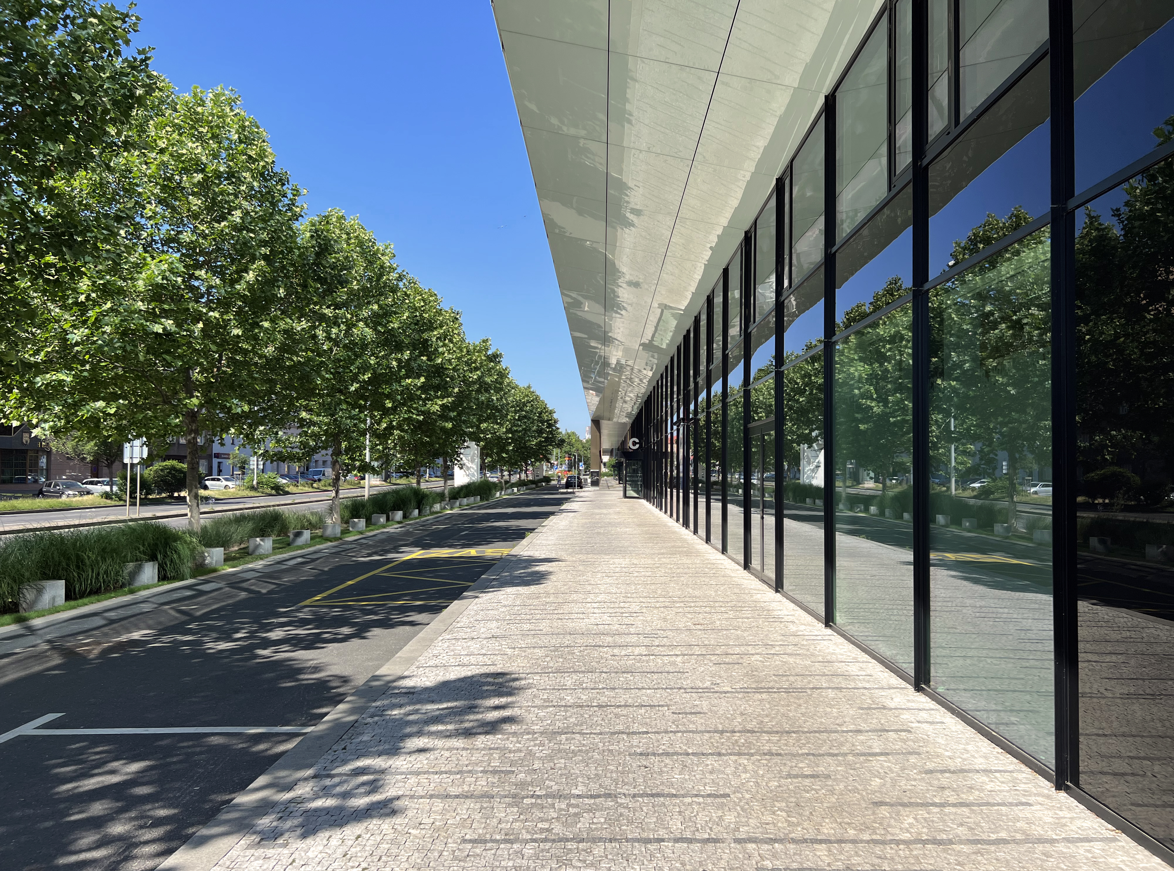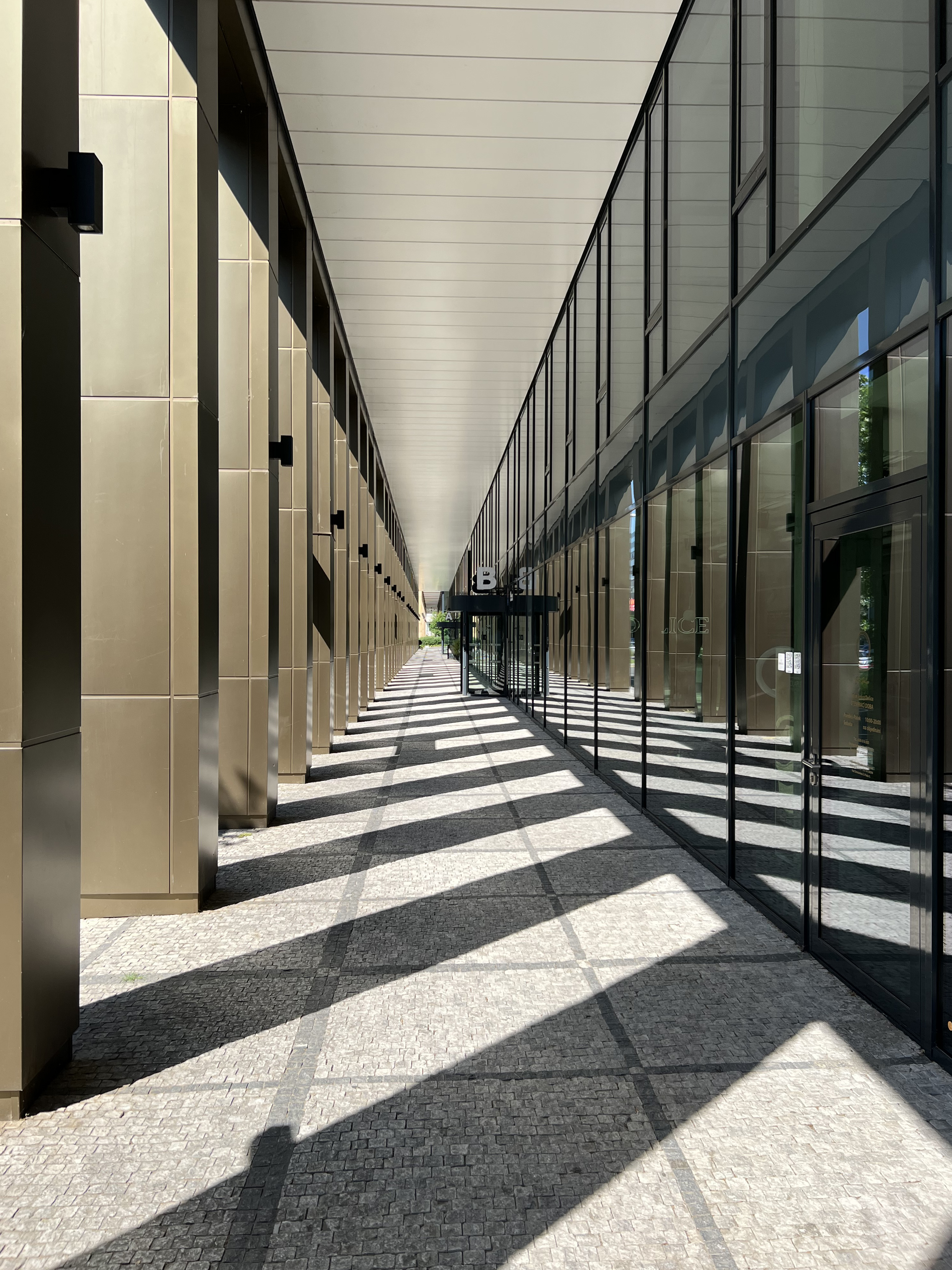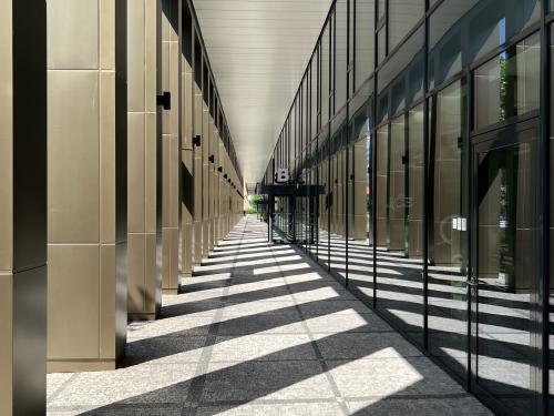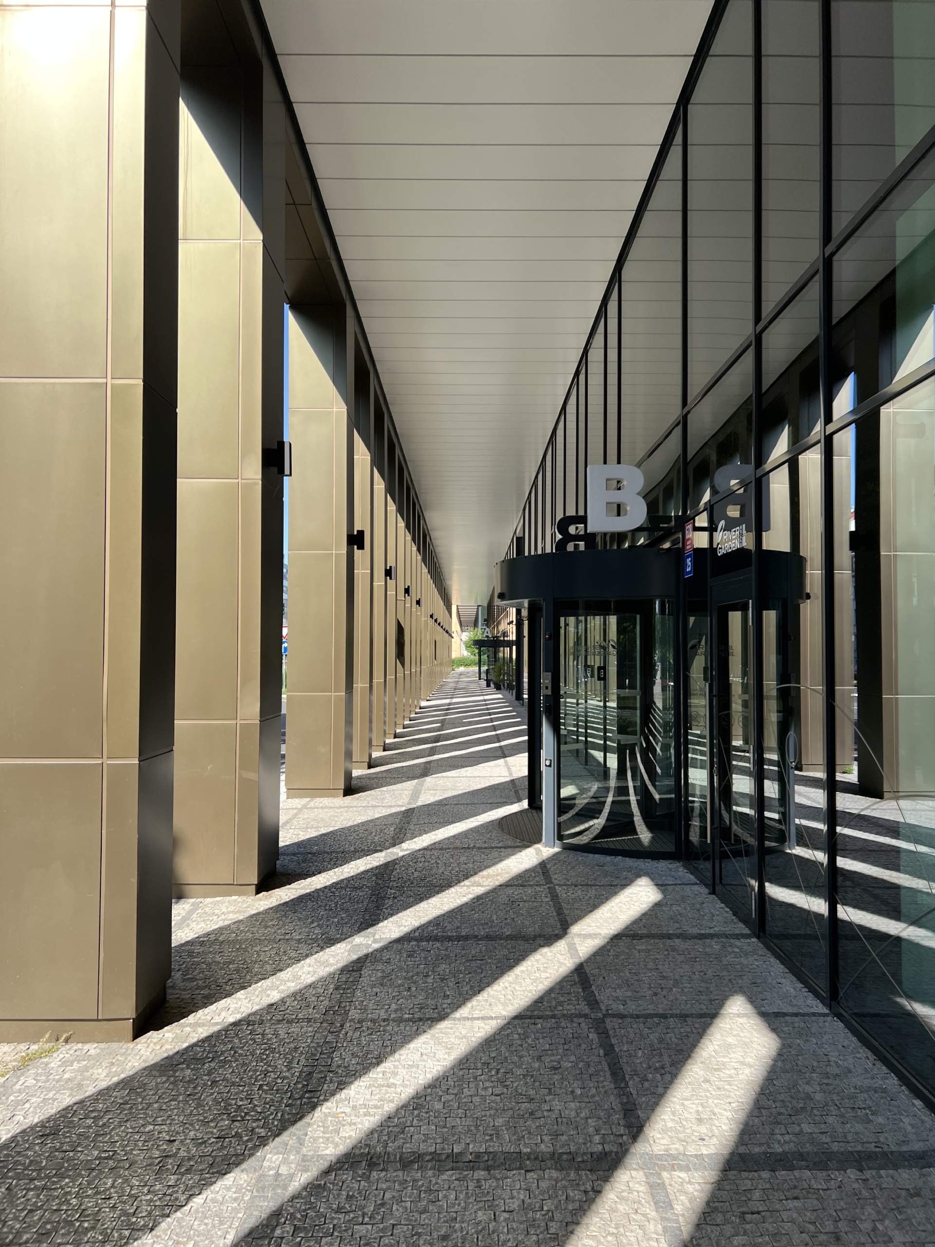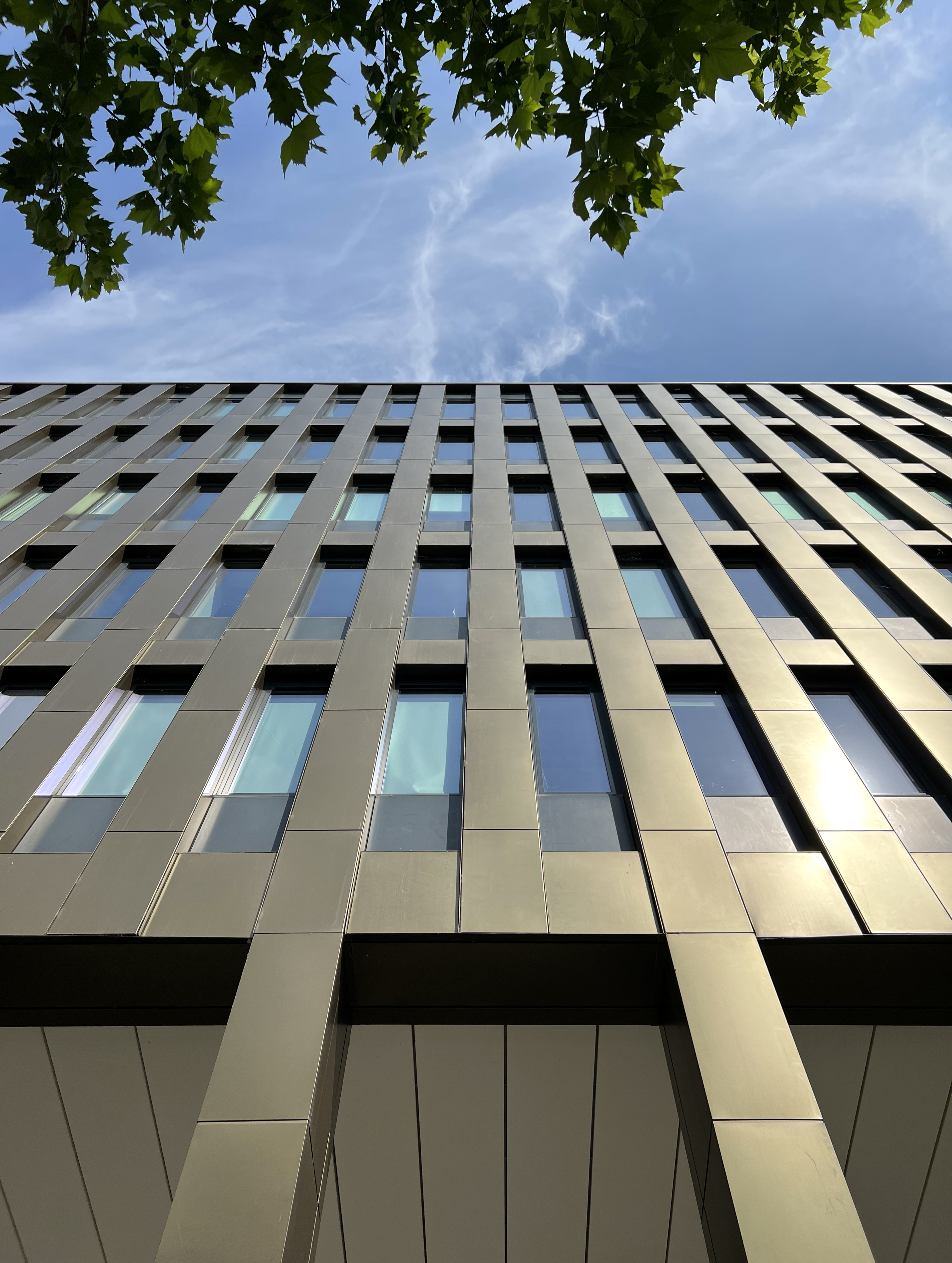 Pravidelný rastr oken s vertikální proporcí doplňuje zlato-bronzová hliníková fasáda postavená na klasické sloupové kolonádě s otevřeným podloubím s nákupními plochami a s průchody do zeleného vnitrobloku.